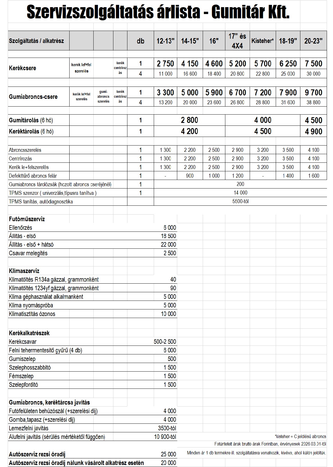 Gumiszerelési árlista 2026.03.01.-től